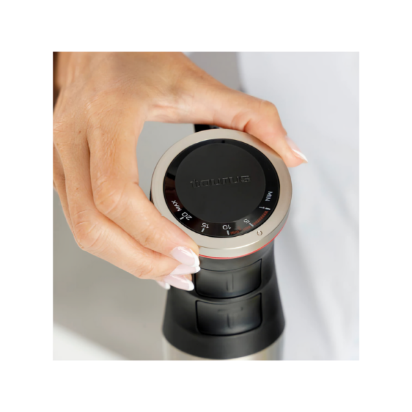 The Bapi® 1500 Luxe hand blender from Taurus delivers professional-grade performance with 1500 W of power, 20 adjustable speeds, TURBO function, and double-action stainless steel blades capable of crushing ice. Designed in Spain for intensive use, it includes a durable stainless steel shaft, Turbo Rotation System for smoother blends, an anti-splash bell, and a 700 ml measuring cup. All accessories are BPA-free and dishwasher-safe, offering power, durability, and convenience in one.