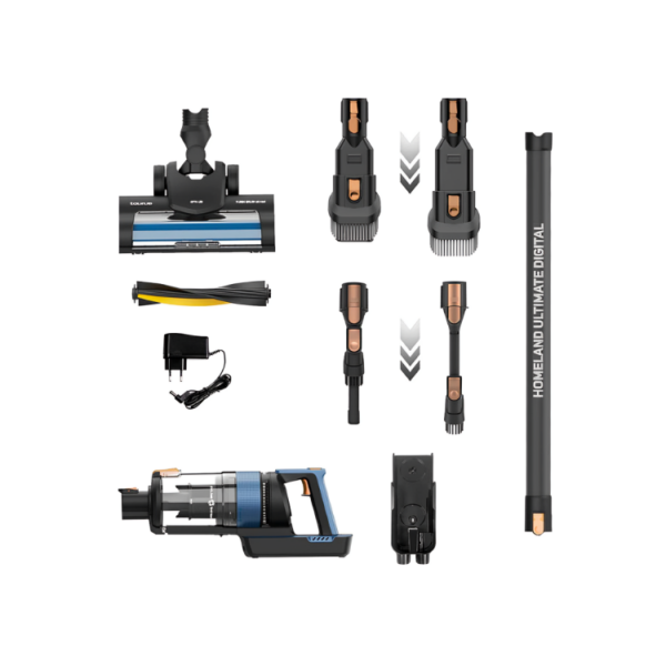 The Taurus Homeland Ultimate Digital broom vacuum cleaner combines a 400W Digital Brushless motor, 21,000 Pa of suction and a removable battery with 55 minutes of autonomy. Its Triple Advanced Filtration system (HEPA, cyclonic and mesh) guarantees efficient cleaning. Includes motorized shoe with ALL ROAD and FUZZY brushes, 600 ml tank and LCD display with blocking warnings. With LED lighting, 180º articulation and complete accessories, it is ideal for all types of surfaces and homes.