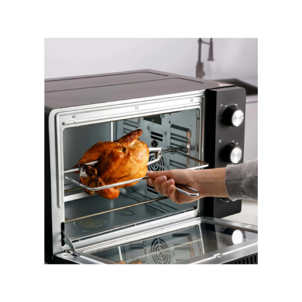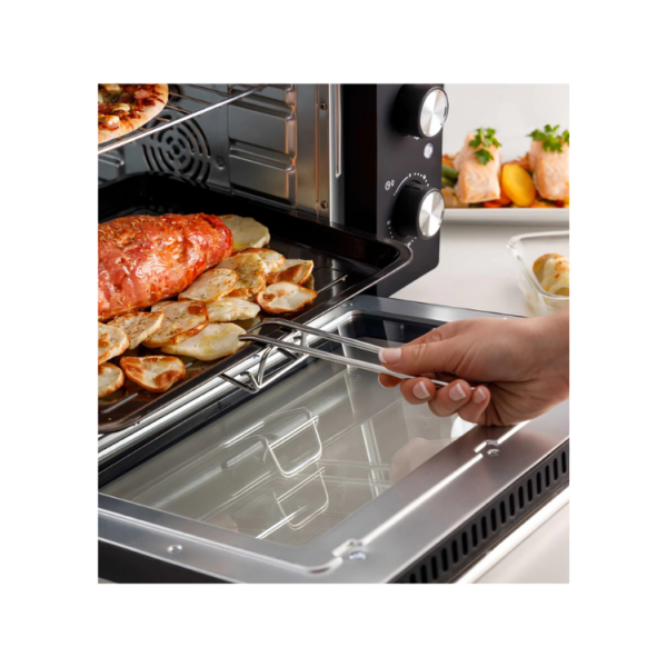 Includes a crumb tray for easy cleaning, rotisserie accessories, and an audible signal that indicates the end of cooking.