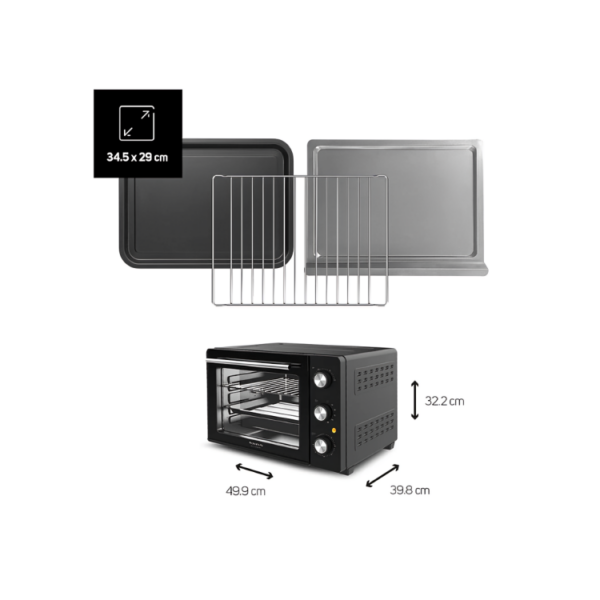 The Taurus Horizon 30 oven offers 1500W of power and a 30L capacity for precise cooking. With a convection fan, grill, and rotisserie function, it achieves even cooking and crispy results. Its adjustable temperature from 100 to 230ºC and 90-minute timer ensure ideal control for every recipe. It features double-glazed glass, an anti-scald exterior, and an extra-large viewing window. A crumb tray and accessories are included. A versatile and powerful oven for your kitchen!